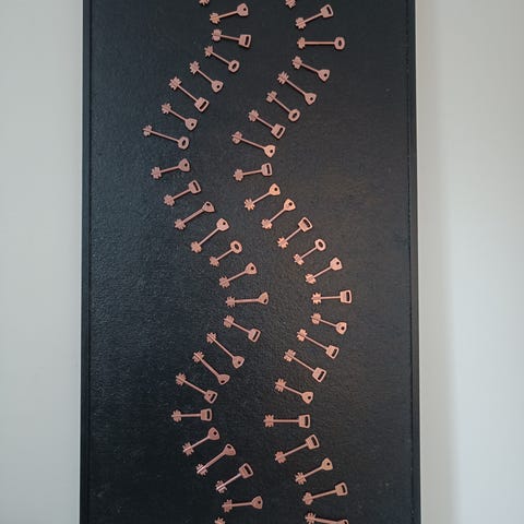 Jokainen avain on kantanut hetken, päätöksen tai rutiinin – kulkenut taskuissa, käsissä ja vuosissa. Ne ovat avaimia oviin, joita ei enää ole, ja paikkoihin, joihin ei voi palata. Puupinta kantaa ajan jälkiä kuten avaimetkin: kulumia, epätasaisuutta ja hiljaista kestävyyttä. Yhdessä ne muodostavat arkiston menneestä, järjestyksen ilman kronologiaa.