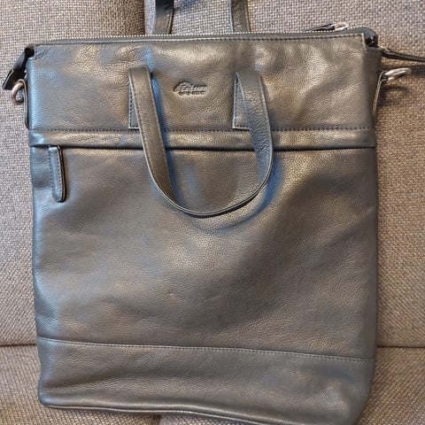 Yhden viikonloppureissun käytössä ollut reppu. Nahkaa. Läppäritasku ja useampi muu tasku. Pehmustetut olkaimet. Paikka myös lentolaukun vetoaisalle. Leveys 28.5 x korkeus 38 x syvyys 18 cm.