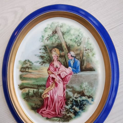 Kaunis posliininen lautanen, käsin maalattu. Hyväkuntoinen. Epäselvä leima (ks.kuvat). Halkaisija 24cm