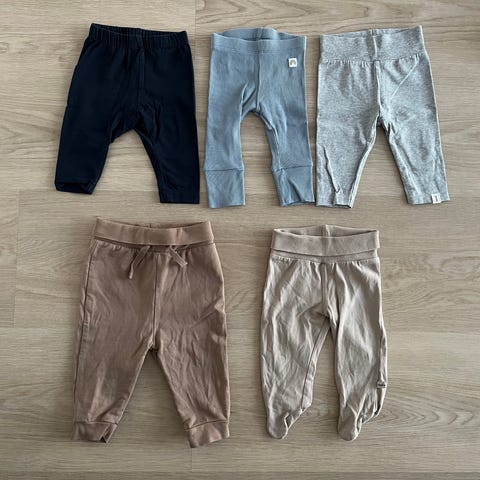 Settinä housuja vauvalle. Hyväkuntoisia, pientä pesuhaitua/väri ei uudenveroinen/yksissä mini tahra. Reima, H&M, Nalle.