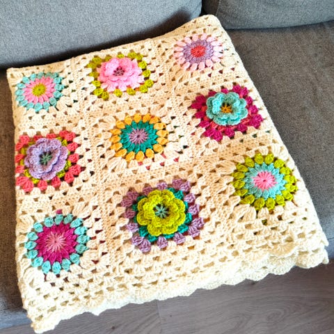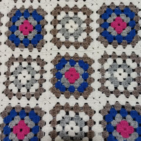 Kaunis, kirjava, käsin tehty isoäidinneliö-peitto/viltti. Koko 135x135 ja painaakin n. 1.5kg