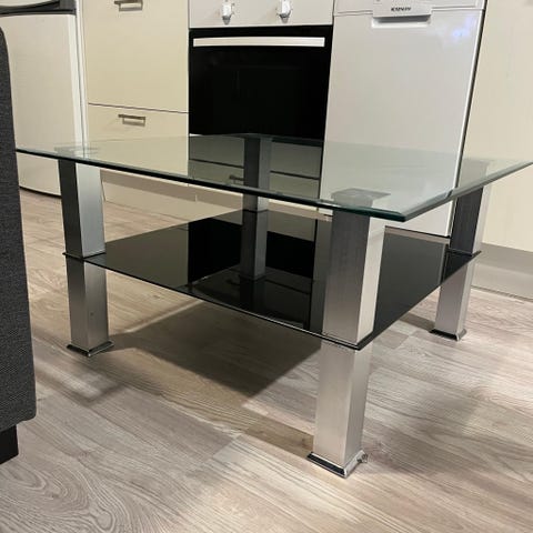 Olohuoneen lasipöytä ja kaksi jakkaraa. Jakkaroissa jonkun verran kulumaa. Pöydän alla säilytystilaa.