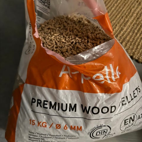 Puupellettejä 1,5 pussia, eli n. 20-25 kg. En omista puntaria, niin en saa punnittua tarkkaa määrää. Puolikkaan pussin sisältö laitettu jätesäkkiin. Voi käyttää myös lemmikin kuivikkeena.