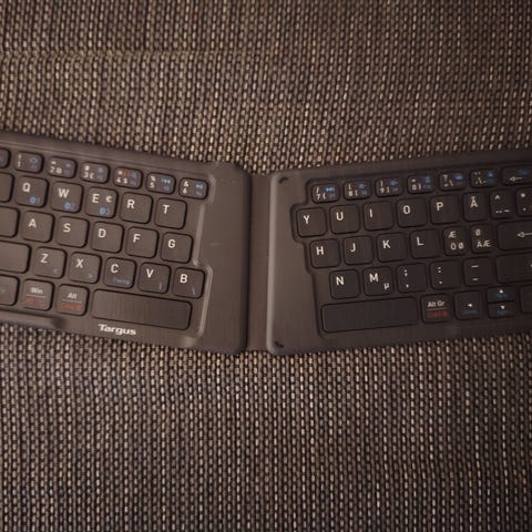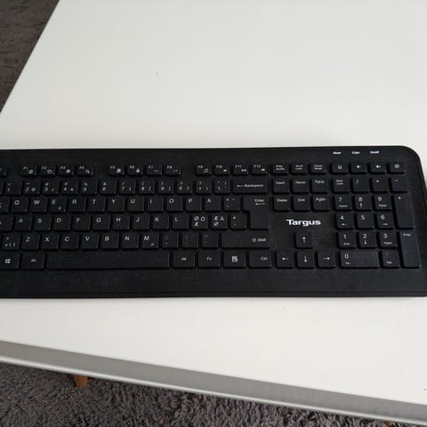 Targus ecosmart langaton näppäimistö. Näppäimistö lataa itse akkuaan etuosan aurinkokennolla (lataa myös sisätiloissa lampuista). Näppäimistö toimii moitteettomasti ja on muuten kuin uusi, lukuunottamatta pieniä naarmuja aurinkokennossa. Näppäimistö yhdistyy langattomasti ultra-alhaisen tehon Bluetooth BLE 5.0:n tai 2,4 GHz:n taajuuden avulla. Näppäimistön DefenseGuard antimikrobinen ominaisuus on imeytettynä itse materiaaliin, joten se ei kulu pois. Antimikrobisen ominaisuuden ansiosta pinta pysyy puhtaampana ja se toimii jatkuvasti estäen mikro-organismien kasvun. Näppäimistön voi yhdistää kolmeen laitteeseen kerralla.