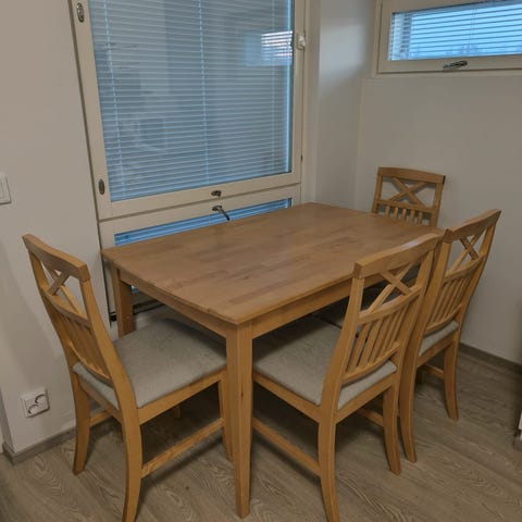 Myyntiin käytetty ja elämää nähnyt valkoinen maskusta ostettu ruokapöytä johon mahtuu 6 ruokailutuolia ympärille. Pieniä lommoja ja värjäymiä on, mutta kelpo vielä seuraavallekkin. Voi varmasti fiksata siistimmäksikin.