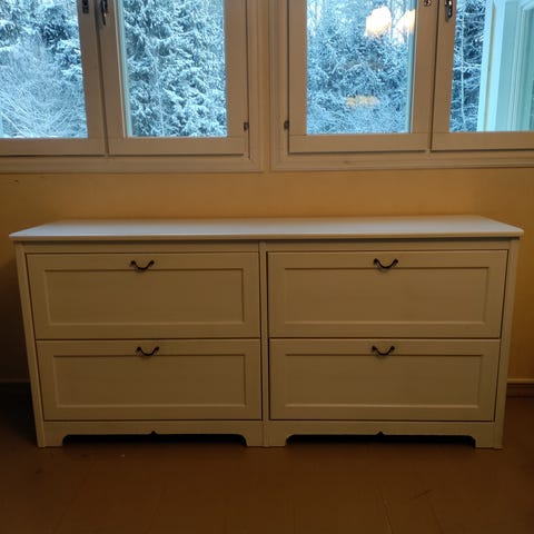 Säilytyskaluste IKEAsta, jossa on peili ja useita laatikoita. Kaluste on valkoinen, ja laatikoiden etupinnat ovat marmorinharmaata väriä. Sopii eteiseen tai muuhun tilaan, jossa tarvitaan peiliä ja säilytystilaa.
