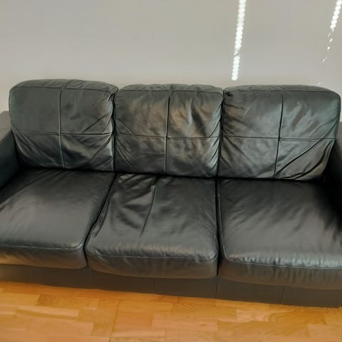 Siistikuntoinen kolmen istuttava musta nahkasohva. Helppohoitoinen, pehmusteet kiinni sohvassa.