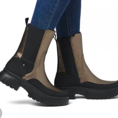 Ulkosyrjällä venyke, jossa kiiltävä rieker-teksti.