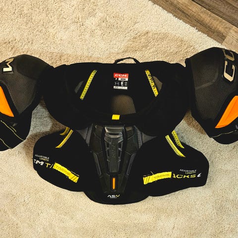 Aktiiviharrastajan erittäin kevyt hartiasuoja. CCM SP Jetspeed FT680 Jr. Koko L. Hyvässä käytetyssä kunnossa, ehjä ja siisti. Pestyt, ei tuoksuja. Tarrat pitävät hyvin.