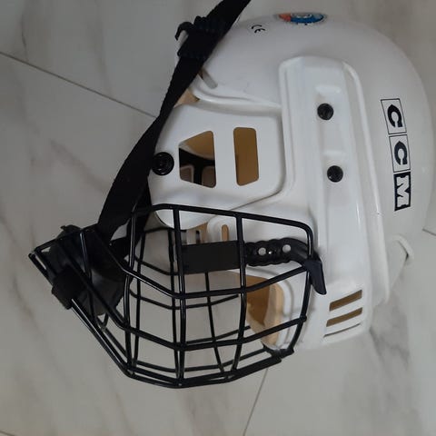 Jääkiekkokypärä ristikolla, Bauer-merkkinen. Uutena ostettu, yhdellä lapsella ollut käytössä. Sisätiloissa säilytetty. Kypärän edessä tumma värimuutos.