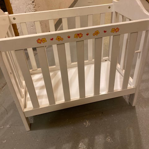 Perhonen lasten leikkisänky vaaleanpunainen ja sininen, muovinen runko ja pehmustettu sisäosa, suunniteltu lasten leikkeihin. Merkkiä en muista😅