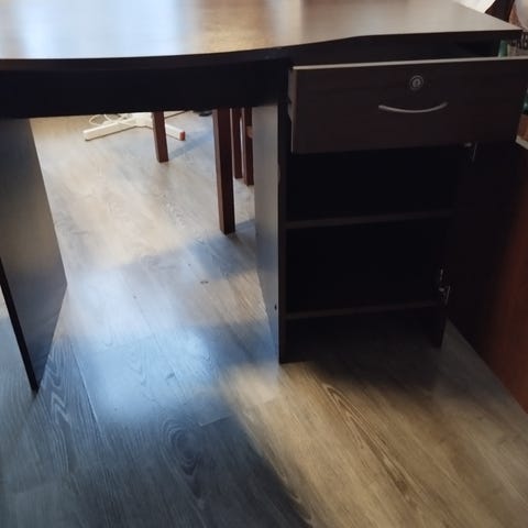 Pieni kirjoituspöytä koivumelamiini/valkoinen melamiini. Toisessa päässä 4 laatikkoa joista ylin lukittava ja toisessa päässä hylly. Pieneksi kirjoituspöydäksi tai esim ompelupöydäksi.