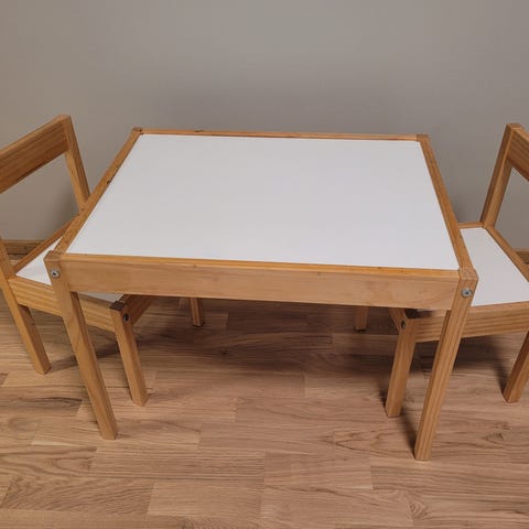 Myyntiin muuton tieltä puiset lasten pöytä ja neljä tuolia. Vanhoja ja käytön jälkiä löytyy, mutta erittäin tukevat.