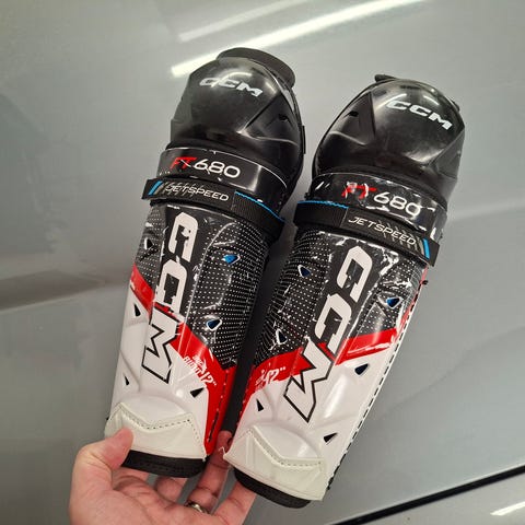 Aktiiviharrastajalle CCM Jetspeed FT680 polvisuojat. Koko 12" eli 30cm. Etuosan kuviot kuluneet, mutta tuote itsessään on ehjä, laadukas ja puhdas. Irrotettavat sisäpehmusteet konepestäviä. Tarrat ovat napakat.
