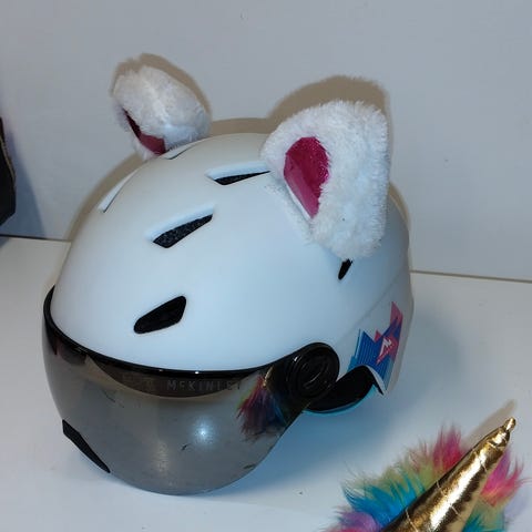 Musta laskettelukypärä integroidulla visiirillä. Korvien kohdalla pehmustetut suojat sekä säädettävä leukahihna. Kypärässä on ilmanvaihtoaukot ja ulkopinnassa tarroja. Soveltuu lasketteluun ja lumilautailuun.