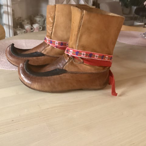 Vuorettomat paulakengät tai paulapieksut. Kokoa näistä en löydä, mutta arvioisin että 38. Käsittääkseni nämä on Töysän kenkätehtaan valmistamat.