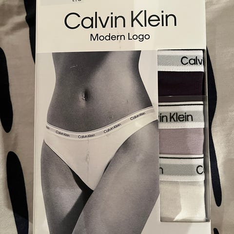 Myyntiin uudet, käyttämättömät, avaamattomassa paketissa olevat Calvin Kleinin Modern Logo alushousut stringit / thongs kolmen kpl:en paketti kokoa L.