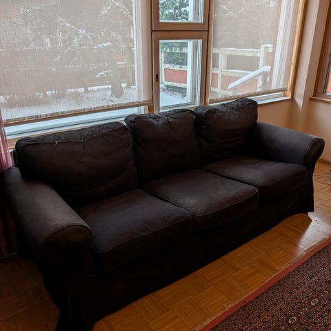 Toisen käsinojan päässä kulumaa, muuten ihan hyvä ja napakka. Helppo nouto omien menojen mukaan, sohva jo rapussa. 5.krs. Ei välttämättä mahdu hissiin. Eli vähintään kaksi, mielellään kolme kantajaa mukaan.
