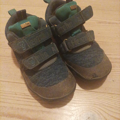 Ok kunnossa olevat kahden pojan käyttämät paljasjalkakengät. Tarrat pitää. Märkänä sisäpuolella olevan villan haju on pistävä, mutta kuulemma kuuluu ominaisuuksiin. Kuivana ei mitään havaittavaa hajua.