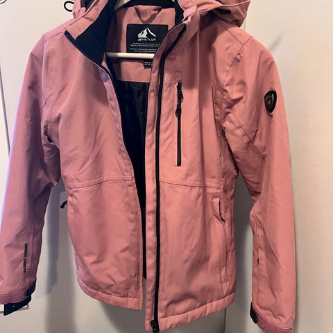 Hyväkuntoinen Whistler-merkkinen talvitakki. Yläosa ja huppu mustat, muuten tumman harmaa. Kiinteä huppu, vetoketjutaskut.