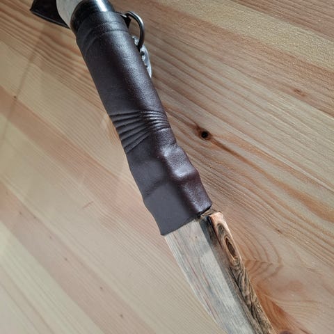 Puukko on hyvässä kunnossa, mutta kotelossa on havaittavissa kulumisen merkkejä tauksessa.