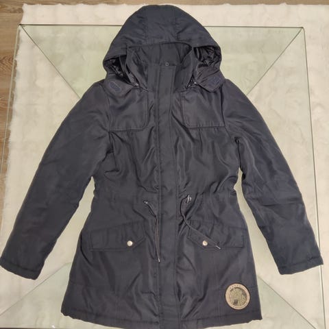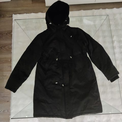 Hyväkuntoinen talvitakki, päällinen puuvillaa, tikkivuori. Täysin musta. Kuvissa heijasteita tai muuten se voi näyttää oikeaa väriä harmaammalta. Säätö vyötäröllä. Piilonepparit osin ja vetoketju. Huppu. Kiva kaareva helma. Reilu käytännöllinen mitta talveen. Unisex.