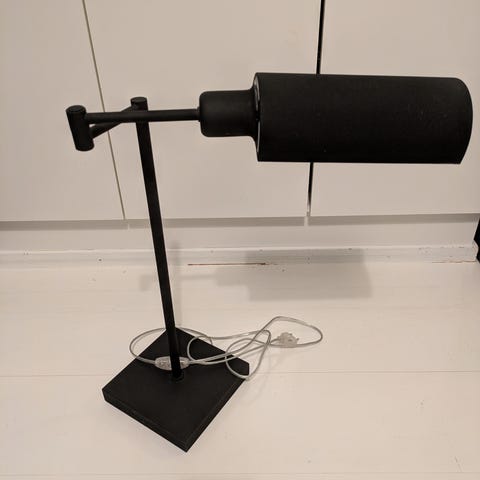 Tyylikäs moderni pöytävalaisin, joka on valmistettu mustasta metallista. Valaisimessa on kolmiomainen jalusta, joka antaa sille vakautta ja modernia ilmettä. Se on varustettu mustalla johdolla ja kytkimellä, mikä tekee siitä käytännöllisen valinnan moneen tilaan. Valaisimen kunto on hyvä