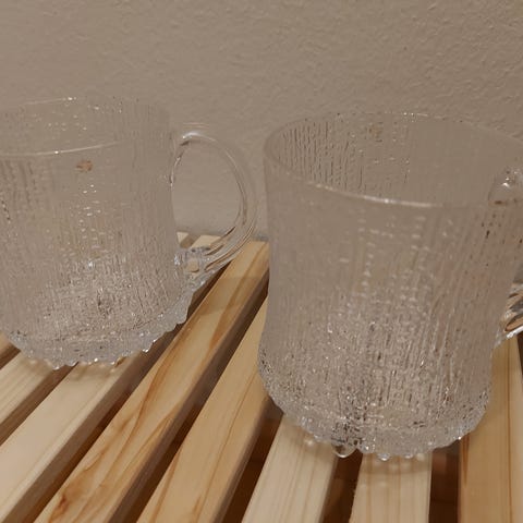 Myydään 4 kpl Tapio Wirkkalan suunnittelemaa Iittalan Ultima Thule sarjan kahvallista olut tuoppia.