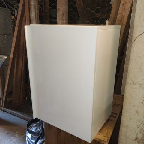 Ikean kaappi mahtuu pieneen tilaan. Ylhäällä on hyllyt ja alhaalla iso vetolaatikko.