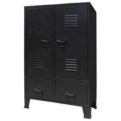 Kaapissa on 2 säädettävää sisähyllyä, joiden ansiosta voit viikata vaatteesi siististi eri kategorioihin, sekä 2 vetolaatikkoa sukkien, alusvaatteiden jne. säilyttämiseen. Kussakin ovessa on nimikylttipidike sekä säleventtiilit, jotka korostavat sen teollista pukukaappityyliä. Tämä säilytyskaappi on valmistettu levymetallista, joka on kestävä ja helposti puhdistettava materiaali. Se on helppo koota.