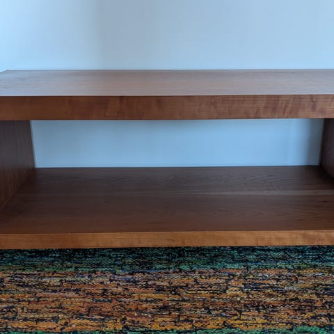 TV-taso, johon mahtuu paljon, mutta alaosan voi jättää tyhjäksikin. Kotimainen Paksu-kaluste. Joitakin käytön jälkiä, mutta yleisilme siisti. Liikkuu pyörillä. Kahdessa pyörässä stopparit.