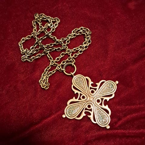 Komea, hyvin säilynyt pronssikoru, jossa 70cm ketju. Riipuksen koko 5,5cm x 5,5cm.