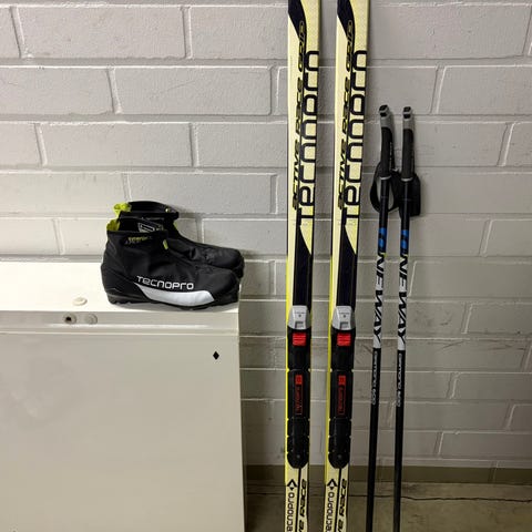 Sukset Atomic 120 cm sns-profiilin siteellä, sauvat Exel 95 cm, monot Salomon koko 33. Monoiksi voi vaihtoehtoisesti ottaa koon 31 / 32 tai 34 / 35 monot.