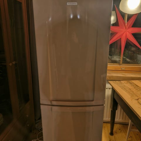 Keittiöremontin tieltä purettu integroitava jääkkaappi-pakastin, kalusterunko ja -ovet.