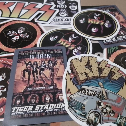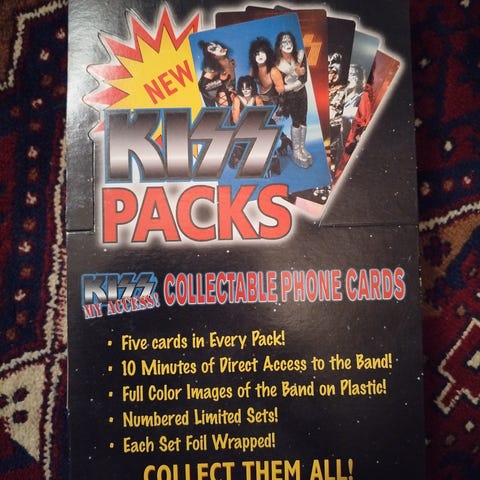 Leikkaamaton arkki KISS-keräilykortteja. Ollut vuosia rullattuna, joten tahtoo palata muotoonsa. Silmiin ei osunut kiiltokortteja.