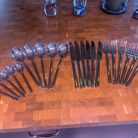 Hackman aterinsetti, joka sisältää 6 veistä ja 6 haarukkaa. Valmistettu ruostumattomasta teräksestä, soveltuu keittiö- ja ruokailukäyttöön. Käytön jälkiä, mutta hyvässä ja siistissä kunnossa. Kulkeutuu myös menojen mukana, kysele tarkemmin.