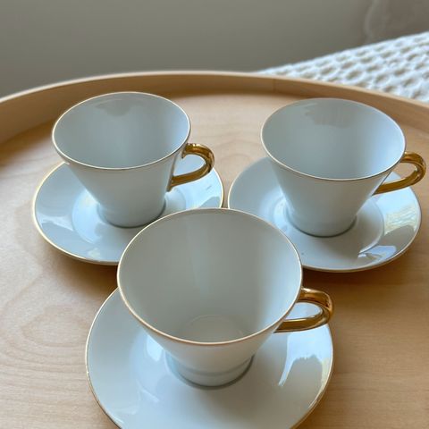 Arabia Kultakorva kahvikupit ja lautaset.