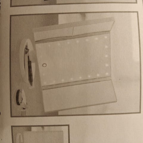 Peili, jossa on LED-valaistus ja kosketuskytkin, mistä voi säätää valon kirkkautta. Metallinen jalusta ja kehys. Sopii esimerkiksi meikkiin ja kasvojen hoitoon. Toisella puolella peili, joka suurentaa. Voin laittaa tarvittaessa lisää kuvia.