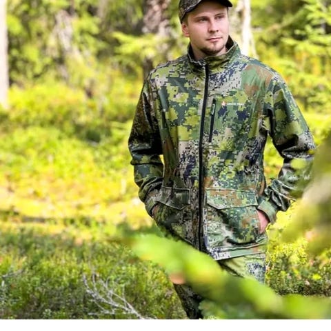 Digitaalinen maastokuvio. Asu koostuu takista ja haalarihousuista, jotka on suunniteltu metsästykseen. Paljon taskuja mm. puhelintasku. Koko XL. Todella lämmin. Irrotettava huppu.