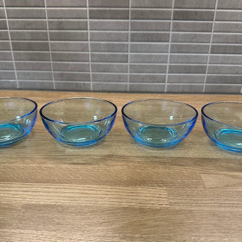 Iittala glasskålar i gott skick, 6 st. Ytorna är snygga och glänser. Iittala-klistermärken är nötta. Skålarnas mått: höjd 6,5 cm, diameter 9,5 cm, fotens diameter 5 cm.