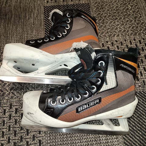 Reilusti käyttöä nähneet maalivahdin luistimet. Käytönjälkiä on. Nilkasta paikattu vaatelaastarilla.