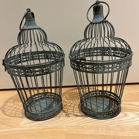 Metallinen lintuhäkki tuikkukynttilälle. Korkeus noin 21 cm ja halkaisija 11 cm.