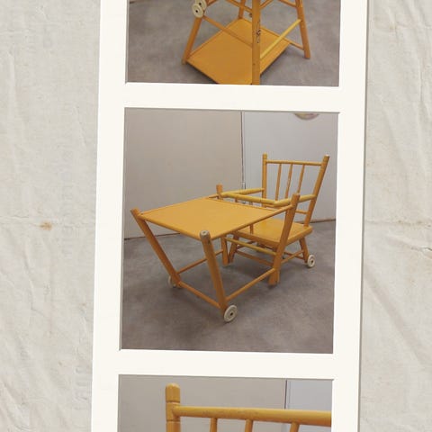 Lasten syöttötuoli, valmistettu puusta, väriltään punainen. Tuolissa on turvakaari ja jalkatuki. Tuoli on varustettu pyörillä helppoa siirtämistä varten. Nouto.