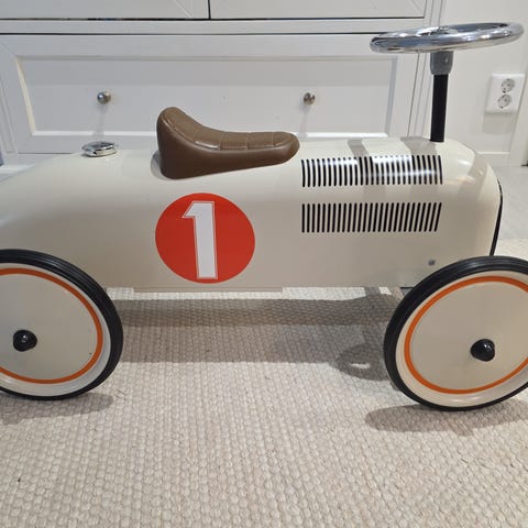 Pientä kulumaa ja käytön jälkeä. Kirskuu kääntäessä ja ajaessa. Ollut meillä koristeena.