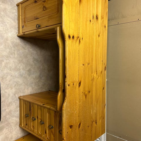 Työpöytä. Ovissa ja pöydän etureunassa pientä kulumaa.