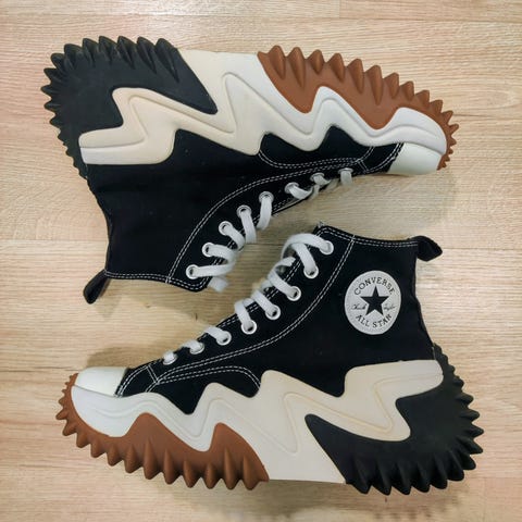 Converse Tennarit, koko 42,5. Mustat kangaspintaiset tennarit, joissa valkoinen kumipohja ja nauhat. Kengät ovat käytetyt ja niissä näkyy käytön jälkiä.