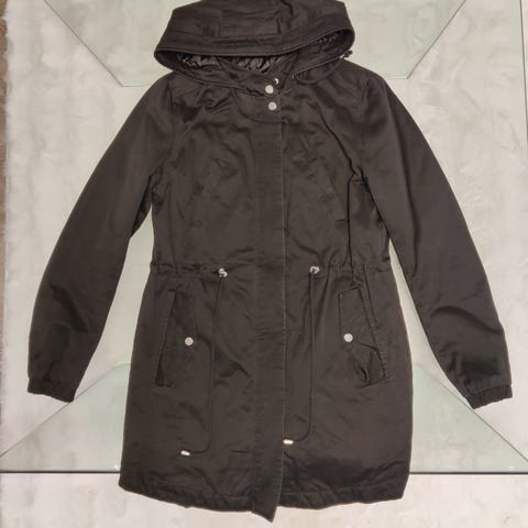 Siisti ja paksu talvitakki. Hupussa ja yläselässä karvavuori. Musta. Väri ei toistu kuviin hyvin. Vyötäröllä ja alareunassa säätömahdollisuus. Resorit hihansuissa.
