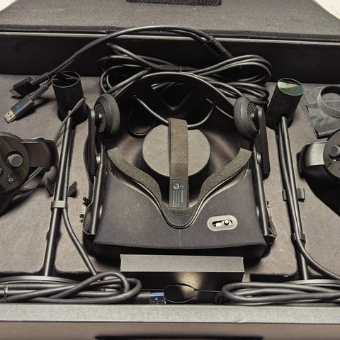 Mukana kaikki mitä laatikossa tuli. Mukana on siis myös pahvilaatikko missä Oculus Rifti S:n oma laatikko tuli.