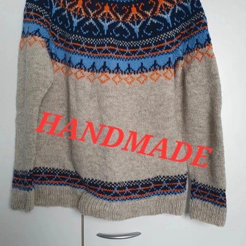 Käsin tehty, hyvä laatuinen villapaita. Muutama haalea jälki, huomioitu hinnassa. 100% villaa