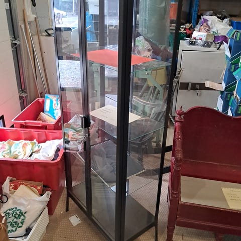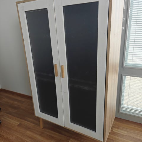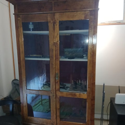 Asevitriini koostuu kahdesta 114 cm leveästä osasta, korkeus 142 cm ja syvyys 32 cm. 2 liukuovea kummassakin ja kumpaankin mahtuu 10 asetta. Ei ole tehdasvalmisteisia vaan jonkun itse tekemiä. Tarrat reunasta saa tietenkin irrotettua.